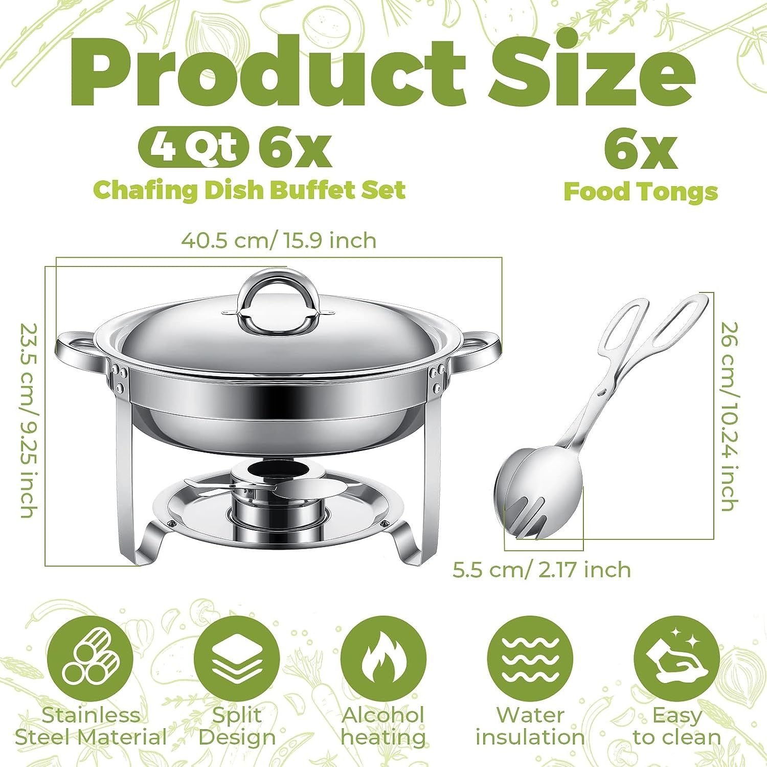 6 Sets of Chafing Dish1.Lid for upcover x 6 2.Food pan x 63.Water pan for heating x 64.Supporter for pan x 65. Two pcs for fuel holders x6
